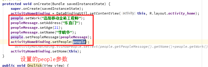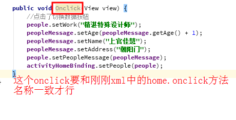 然后在activity中写好刚刚定义的Onclick方法:更新数据就是重新复制给people即可,在将重新复制的people赋值给binding那个对象即可