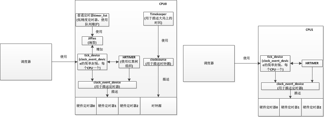 ->tick_periodic()//其中通过TICK_DO_TIMER_BOOT指定一个CPU更新全局jiffies(对jiffies所在地址进行操作),更新墙上时间(更新底层数据结构clock_source和timerkeeper,供上层date命令使用)。