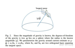需要对重力进行优化的原因主要是因为在之前的线性初始化过程中并没有对重力的幅度进行限制,所有重力只有两个自由度。在许多场合下,重力的幅度是已知的,因此可以重新参数化重力向量在切平面的两个变量,与重力正交的且在切平面上的两个向b1和b2如下图所示: