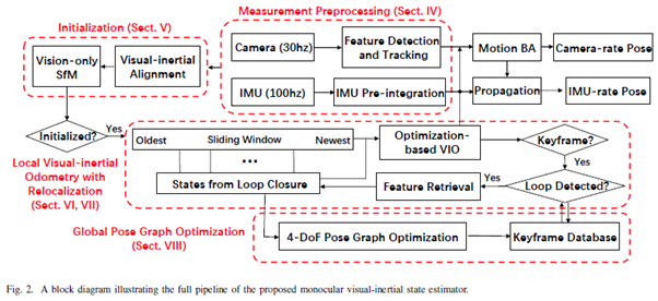 对于单目VINS,众所周知,需要加速度激励以测量尺度。这意味着单目VIN估计器不能从静止状态启动,而是从未知的移动状态发动。同时要认识到视觉惯性系统高度非线性的事实,在估计器初始化方面还有重大挑战。两个传感器的存在也使得摄像机-IMU的外部校准至关重要。最后,为了消除在可接受的处理窗口内的长期漂移,提出了一个完整的系统,包括视觉惯性里程计、回环检测、重定位和全局优化。