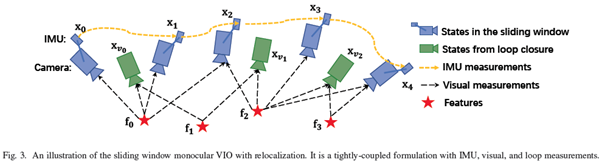 批量图优化或集束调整技术(BA)维护和优化所有测量值以获得最优状态估计。为了达到恒定的处理时间,流行的基于图的VIO方法[8][16][17]通常采用边缘化过去的状态和测量来优化最近状态的有界滑动窗口。由于对非线性系统迭代求解的计算要求很高,很少有基于图的非线性系统能够在资源受限的平台(如手机上)实现实时性能。