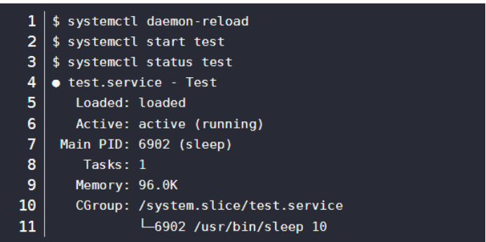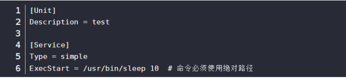 例如,编写一个/usr/lib/systemd/system/test.service运行sleep进程: