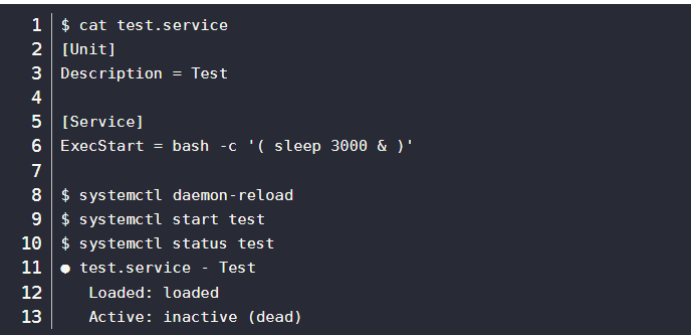例如,以运行bash -c '(sleep 3000 &)'的simple类型的服务,被systemd监控的bash进程会在启动sleep后立即退出,于是systemd会立即杀掉属于该服务的sleep进程。
