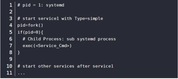 对于Type=simple来说,systemd系统在fork出子systemd进程后就认为服务已经启动完成了,所以systemd可以紧跟着启动排在该服务之后启动的服务。它的伪代码模型大概是这样的: