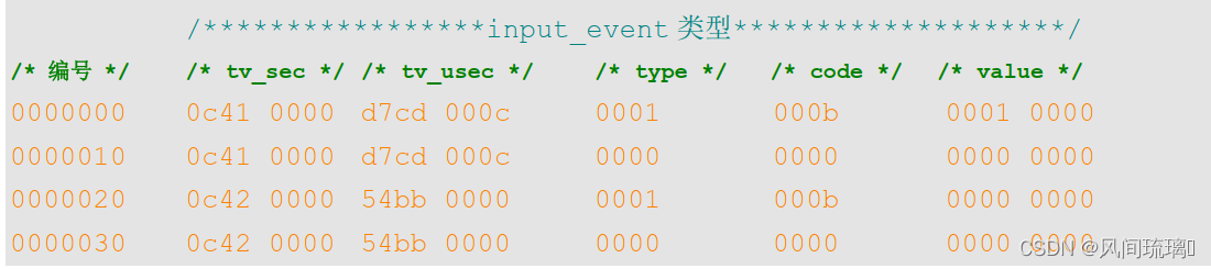 以上就是input_event 类型的原始事件数据值,采用十六进制表示。