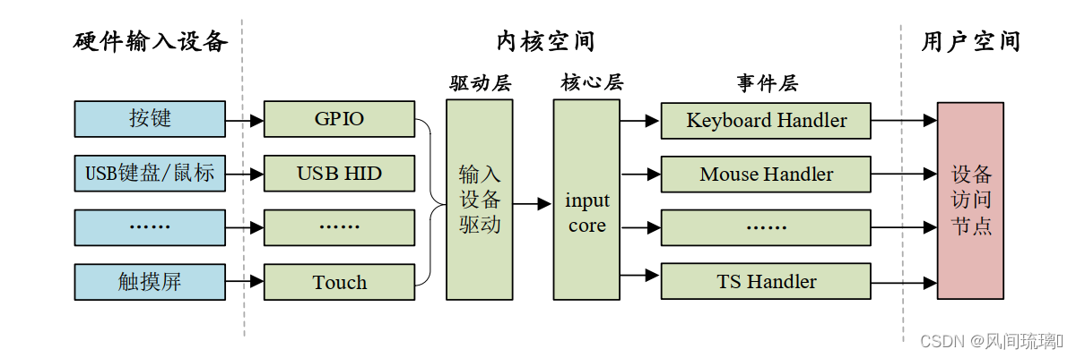 左边是最底层的具体设备,比如按键、 USB 键盘/鼠标等,中间部分属于Linux 内核空间,分为驱动层、核心层和事件层,最右边是用户空间,所有的输入设备以文件的形式供用户应用程序使用。