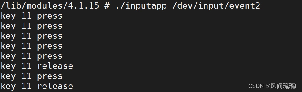 当按下或者释放开发板上的按键以后都会在终端上输出相应的内容,提示哪个按键按下或释放了,在 Linux 内核中 KEY_0 为 11。