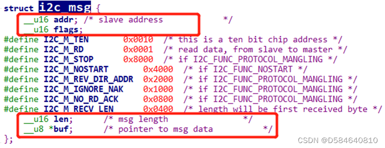 __u16 flags; //标志。如I2C_M_TEN(十位地址标志),I2C_M_RD(接收数据标志)