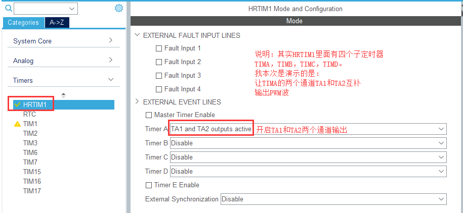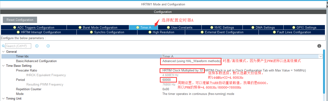 注意:HRTIM1里面有TimerA、TimerB、TimerC、TimerD一共4个子定时器,每个子定时器2个输出通道。还有一个TimerE无输出通道的。。。。。