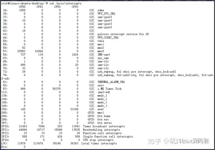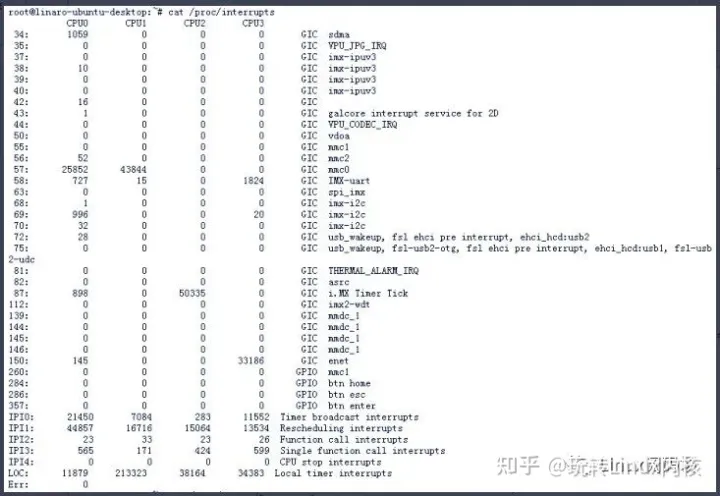 传统上的中断下半部有软中断、tasklet、工作队列,它们的优先级也从高到低。软中断和tasklet工作在中断上下文不允许休眠它的优先级比工作队列高,工作队列工作在进程上下文允许休眠但是优先级最低,所以在实际编程开发中需要我们根据场景选择性的使用。如果是多核CPU,那么可以根据实际的中断情况把不同类型的中断迁移绑定到不同的CPU上,避免不同中断之间的干扰。下面以I.MX6DL硬件平台为例子介绍中断迁移的使用。首先,通过#cat /proc/interrupts指令查看系统的所有中断,如下图所示: