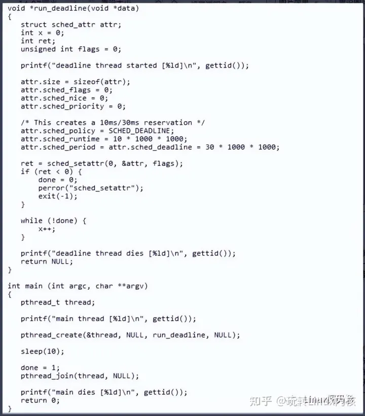 Linux内核目前支持多种调度类,每一种调度类都是同一类型调度策略的集合,目前支持的调度类有:stop、deadline、realtime、CFS、idle。通常情况下进程都可选以上的几种调度类,他们的优先级依次由高到低排序,其中deadline调度类可选的调度策略有SCHED_DEADLINE,realtime调度类可选的调度策略有SCHED_FIFO和SCHED_RR,CFS可选的调度类有SCHED_NORMAI、SCHED_BATCH和SCHED_IDLE。在实际开发过程中,如果对时间有严格要求的实时进程可以选择deadline调度类,其他情况可以参考使用对应的调度策略,改变调度策略,是最直接的一种优化方式。其中deadline调度类的使用参考如下:
