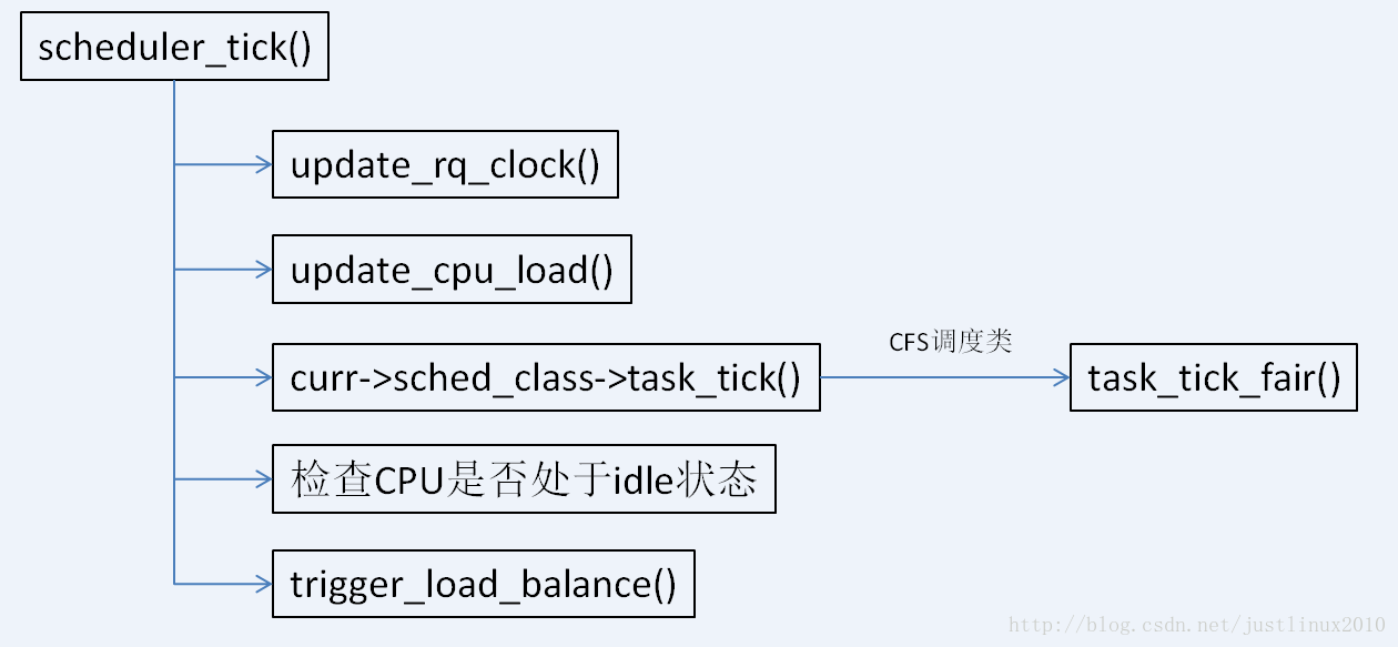 周期性调度器由scheduler_tick()函数实现,在每个时钟中断中都会调用该函数来更新一些统计量,并且会激活当前进程所属调度类的周期性处理接口,代码流程如下所示: