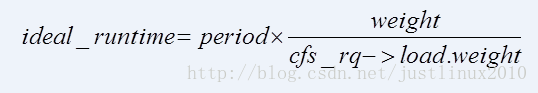 sysctl_sched_latency * (nr_running / sched_nr_latency)),其中nr_running为CFS就绪队列中可运行进程的数量。而当前进程在调度延迟中分得的时间(实际时钟时间)根据下面的公式来计算(period为调度延迟,weight为当前进程的权重,cfs_rq->load.weight为CFS就绪队列的权重):