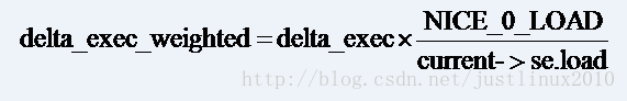 update_curr()根据现在的实际时钟时间和进程的权重计算本次运行的虚拟时钟时间,并更新进程和CFS就绪队列相关的统计信息。update_curr()使用CPU就绪队列的实际时钟时间减去当前进程的开始运行时间(由sched_entity结构的exec_start成员描述),得到当前进程实际的运行时间,然后调用__update_curr()来将实际的运行时间转换为虚拟时钟时间,并且加到当前进程总的运行的虚拟时钟时间(由sched_entity的sum_exec_runtime成员描述)。实际时钟时间和虚拟时钟时间的转换公式为: