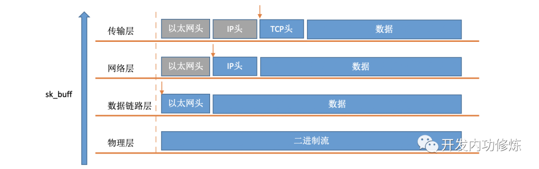 在软中断中,当一个包被内核从RingBuffer中摘下来的时候,在内核中是用struct sk_buff结构体来表示的(参见内核代码include/linux/skbuff.h)。其中的data成员是接收到的数据,在协议栈逐层被处理的时候,通过修改指针指向data的不同位置,来找到每一层协议关心的数据。