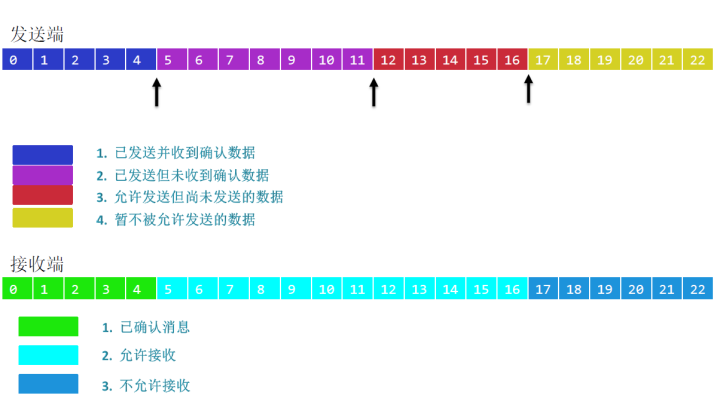 在接收的过程中间,准备好指针。一根指针对应已经发送确认的,另一根指针对应允许接收的最大位置。两根指针之间的长度表示window size。