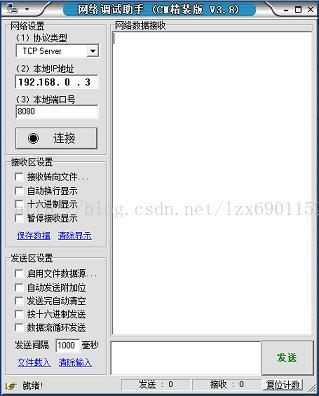3、 打开NetAssiant,打开TCP Sever,设置成如图,点连接。