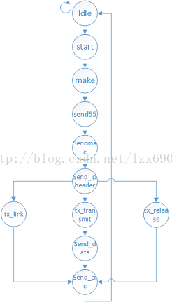4、发送端有一处设计缺陷,即从ram中取出数据计算校验和时候,是以双字为单位,判断门限设置不恰当,造成发送模块只能发送以4字节为倍数的字符串。尚待改进。