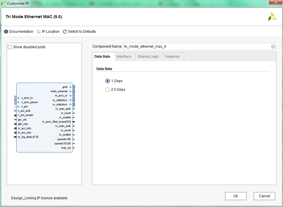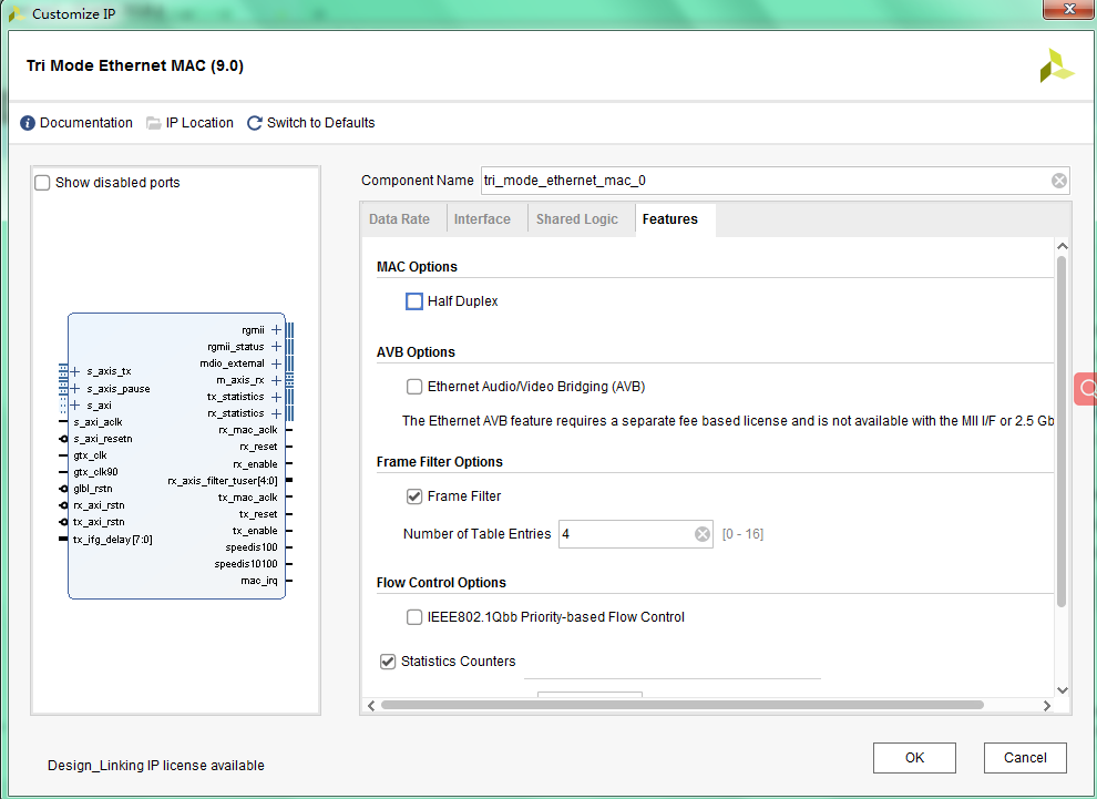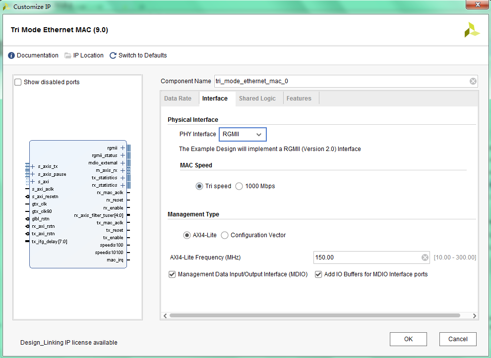 如果启用了MDIO,请选择“为MDIO接口端口添加IO缓冲区”选项以为MDIO接口端口插入I / O缓冲区。这将创建双向I / O总线mdio,并为mdc插入输出缓冲区。如果未选择此选项,则将使用mdio_i,mdio_o和mdio_t端口生成内核。