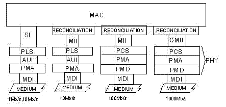 千兆以太网的物理层分为物理编码子层PCS(Physical Coding Sublayer)、物理介质连接子层PMA(Physical Medium Attachment)和物理介质相关子层PMD(Physical Medium Dependent)三层,如下图所示: