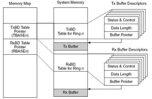 在千兆以太网的驱动中,现在一般都使用一个叫BD表的东西来管理MAC层发送和接收的内存区域,如下图所示: