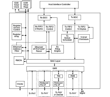 Freescale的MPC8314和P2020都自带了三速以太网控制器ETSEC,可以提供10M,100M,1000M三种速率的接口。当作为以太网时,需要外部的PHY芯片或者Serdes设备与其相连接。每个ETSEC都支持多标准的MII接口,总体结构如下图所示,可以提供GMII,RGMII,MII,RMII,RTBI,SGMII 六种接口,下图为从MPC8314 datasheet中截取的ETSEC的结构图。