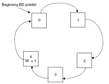 在网口驱动程序中可以看到,每个BD Ring中的BD数量是可变的(我们设为64),而他们之间并没有指针连接,只是一段连续的空间,顺序下来的,所谓的环只是一个虚拟的概念,在最后一个BD时,需要将BD状态位中的W位(Wrap)置一,表示这是最后一个BD,他的下一个BD就是第一个BD。如下图所示: