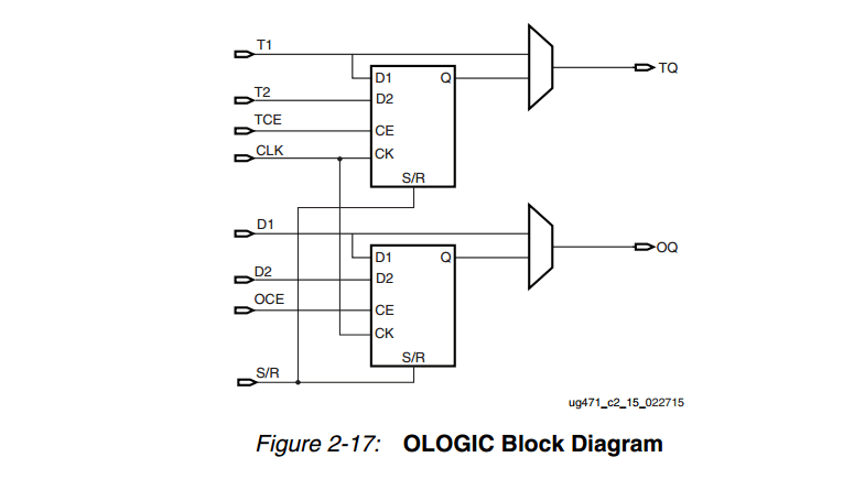 OLOGIC主要由两个block组成,一个用于配置输出路径。另外一个用于配置三态控制路径。这两个block具有共同的时钟,但是具有不同的使能信号OCE和TCE。两者具有由SRVAL属性精致的一部和同步set和reset(S/R信号)。