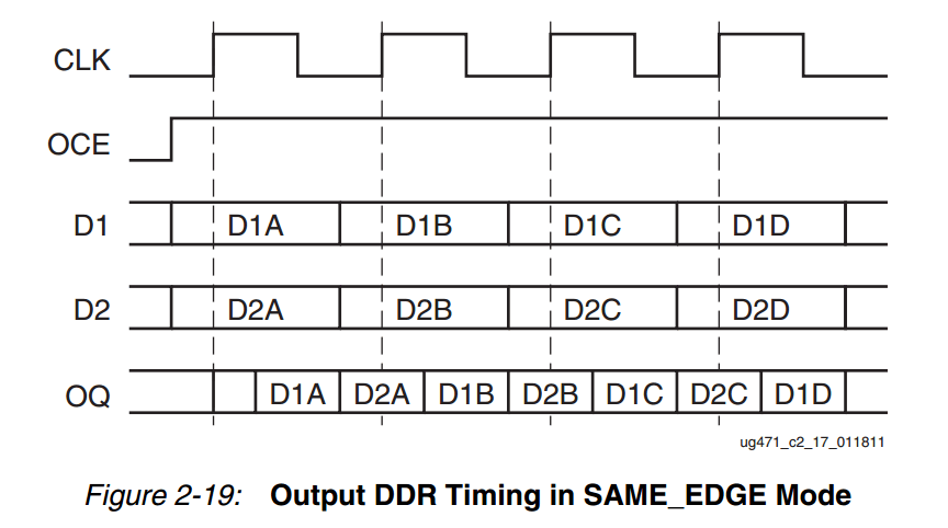 在此模式下,数据可以在相同的时钟边沿从给IOB。相同的时钟沿江数据送给IOB可以避免建立时间违规,并允许用户使用最小的寄存器来执行更高的DDR频率来进行寄存器的延迟,而不是使用CLB寄存器。下图显示了使用SAME_EDGE模式的输出DDR的时序图: