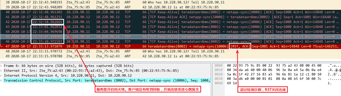 - 配置防火墙丢掉客户端的报文后,客户端开始每隔tcp_keepalive_intvl时长发送一次,发送tcp_keepalive_probes次