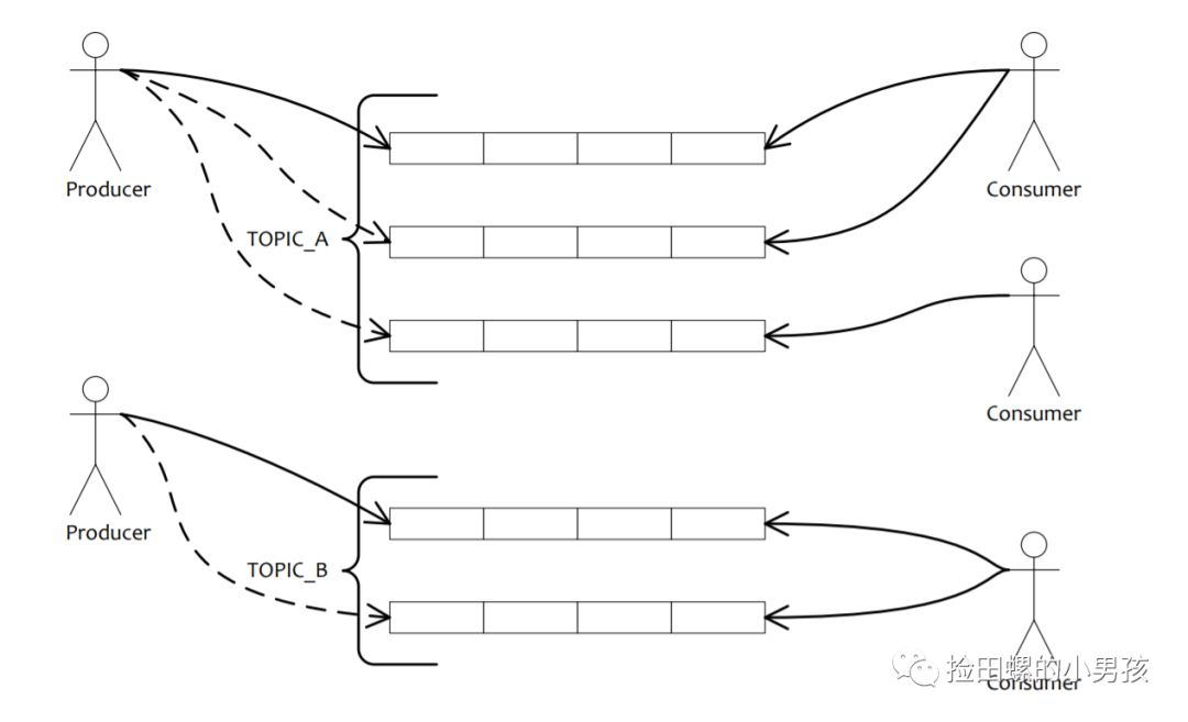 Producer 向一些队列轮流发送消息,队列集合称为 Topic,Consumer 如果做广播消费,则一个 consumer 实例消费这个 Topic 对应的所有队列,如果做集群消费,则多个 Consumer 实例平均消费这个 topic 对应的队列集合。