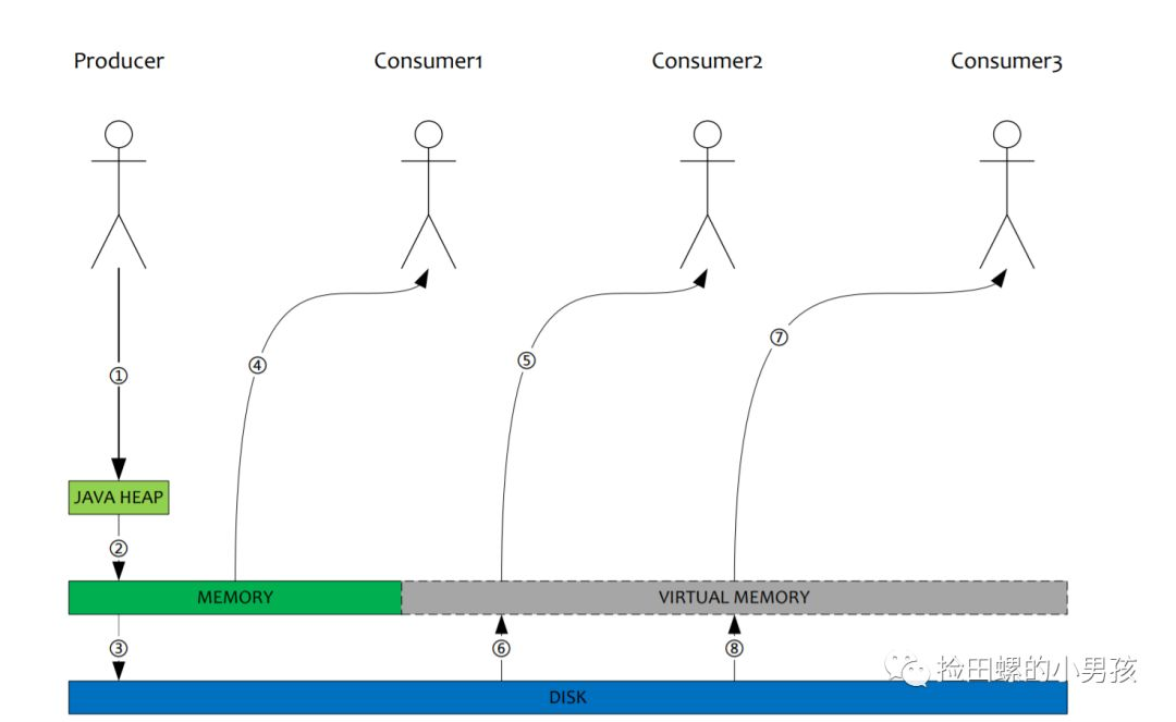 1.Producer 发送消息,消息从 socket 进入 java 堆。