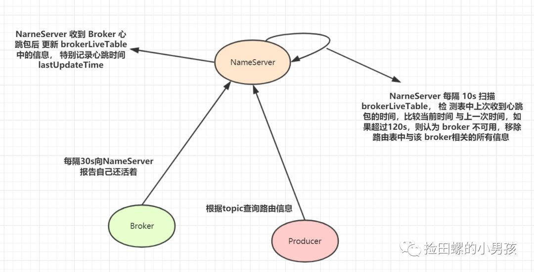 Broker每30秒向NameServer发送心跳包,心跳包中包含topic的路由信息