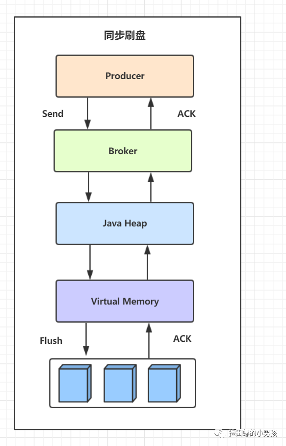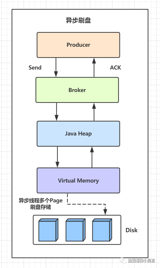 3.Producer 发送消息,由异步线程刷盘,消息从 PAGECACHE 刷入磁盘。