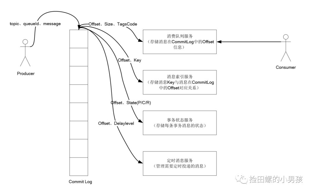 IndexFile为索引数据文件提供访问服务,ConsumerQueue为逻辑消息队列提供访问服务,CommitLog则为消息存储的日志数据文件提供访问服务。
