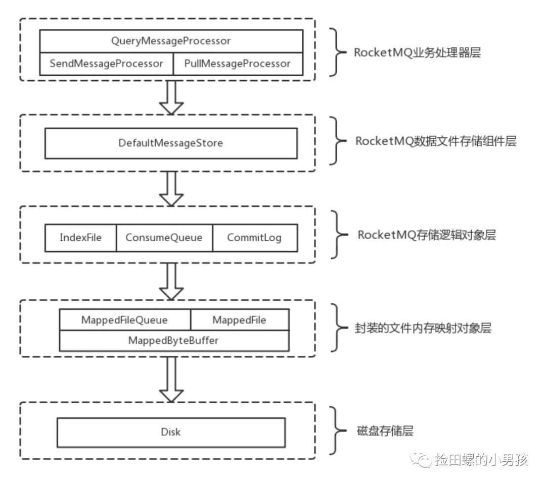 该层主要是RocketMQ的存储核心类—DefaultMessageStore,其为RocketMQ消息数据文件的访问入口,通过该类的“putMessage()”和“getMessage()”方法完成对CommitLog消息存储的日志数据文件进行读写操作(具体的读写访问操作还是依赖下一层中CommitLog对象模型提供的方法);