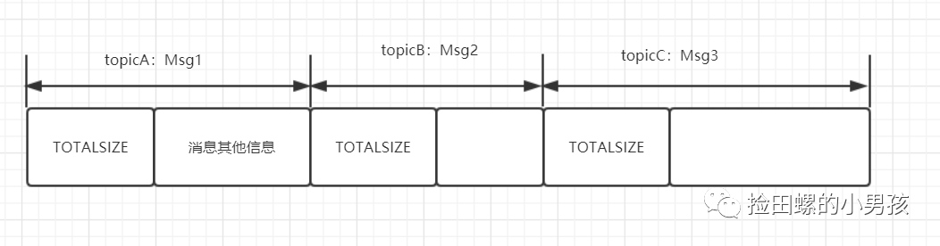 消息存储文件,所有消息主题的消息都存储在 CommitLog 文件中。Commitlog 文件存储的逻辑视图如图所示