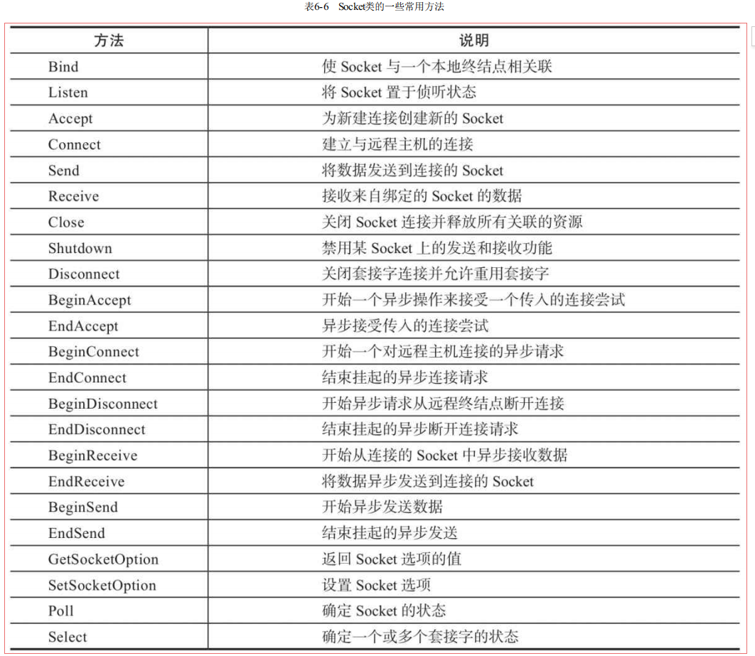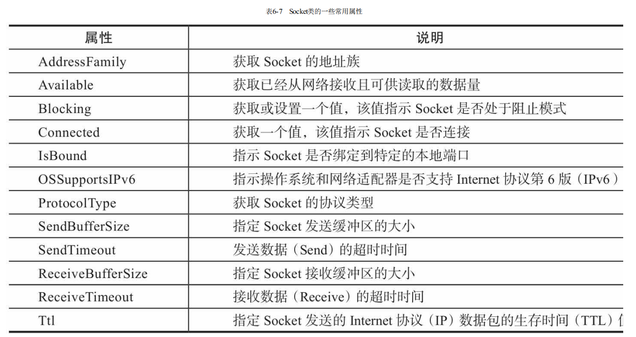 System.Net.Sockets命名空间的Socket类为网络通信提供了一套丰富的方法和属性,表6-6和表6-7列举了Socket类的一些常用方法和属性。
