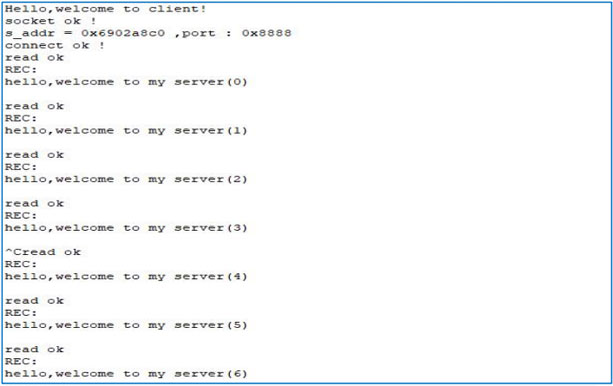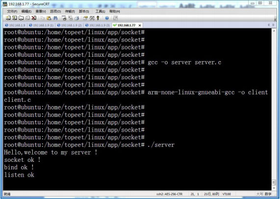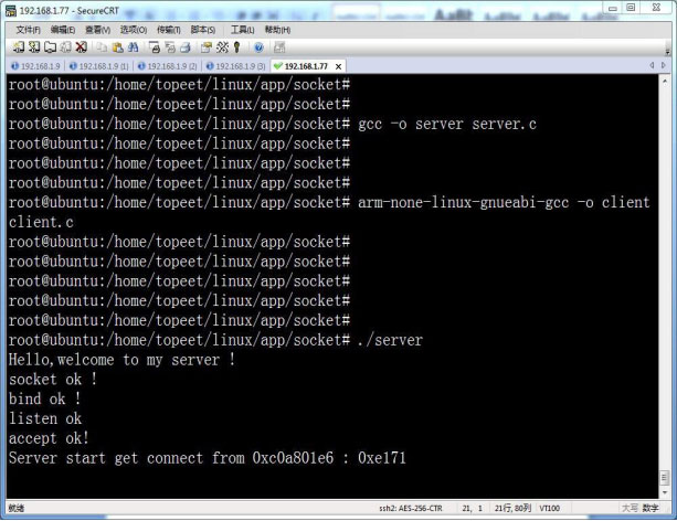 上面命令里面的 192.168.1.77 是虚拟机 Ubuntu 的 IP 地址,看到程序连接成功,首先看一下虚拟机Ubuntu 上的 server 打出的信息,如图 77.1.3。