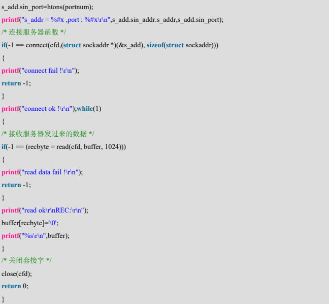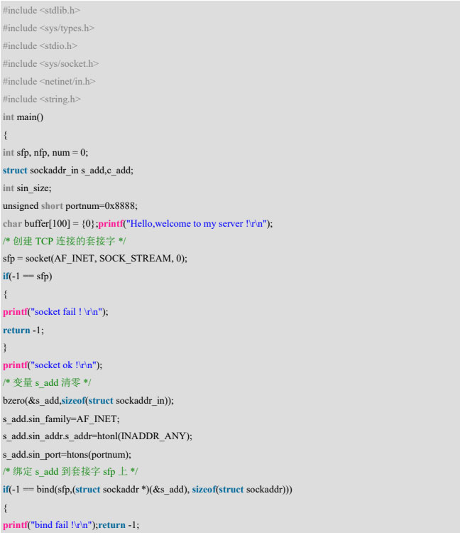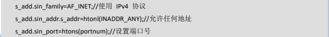 首先是包含一些需要的头文件,然后进入 main 主函数定义了一些变量,然后调用 socket 函数创建套接字,然后调用 bzero 函数把变量 s_add 清零,然后给 s_add 结构里面的变量赋值: