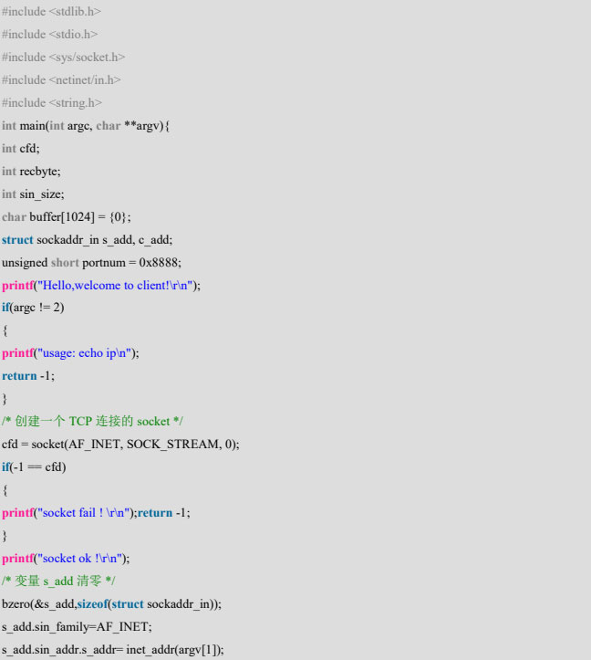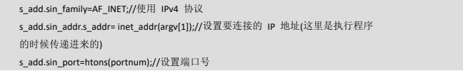 程序首先是包含一些需要用到的头文件,然后是 main 主函数,在 main 函数里面首先是定义了一些变量,然后调用 socket 函数创建一个套接字,socket 函数的第二个参数是 SOCK_STREAM,表示创建的是TCP 连接。然后调用 bzero 函数把变量 s_add 清零,然后给 s_add 结构里面的变量赋值: