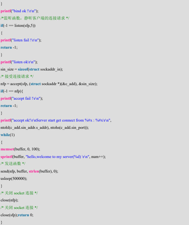 然后调用 bind 绑定函数,使用的是 IPv4 协议族,然后调用 listen 监听函数,监听用户的连接请求。在监听到用户的请求后调用 accept 函数接受请求,然后进入到循环发送的代码,会循环发送“hello,welcometo my server”+发送次数号,最后会调用 close 关闭套接字。