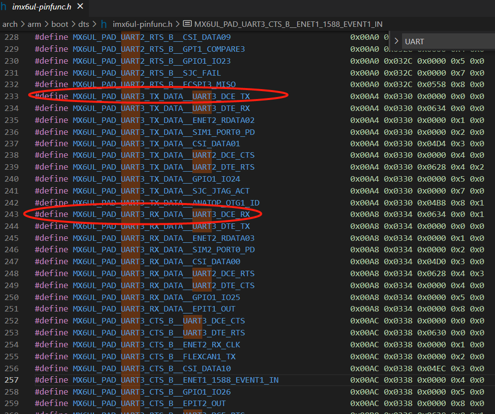 imx6ull 串口的外设有很多,我们可以借助linux内核中的 imx6ul-pinfunc.h 和 imx6ull-pinfunc.h 文件查询IO可复用的功能(路劲在:arch/arm/boot/dts/)另外也可以借助数据手册查看。