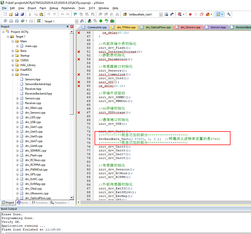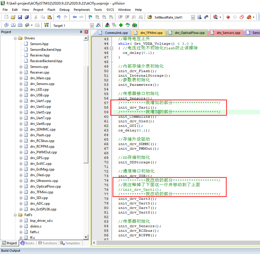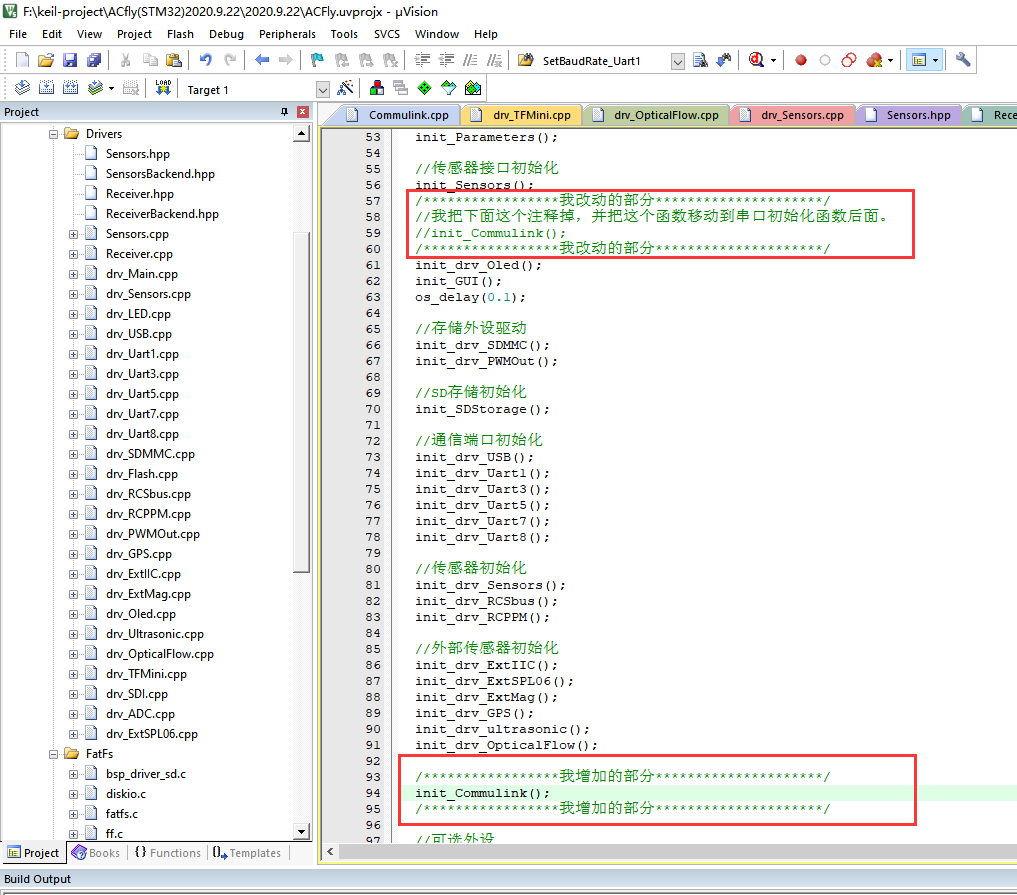 目前四个文件内有改动,commulink.cpp drv_main.cpp GUI.cpp Debug.cpp进到对应文件可以看到,但凡我改动过的地方我都会专门用注释行隔开。(这也是最终确认OK,准备下一步无人机实飞的代码版本)