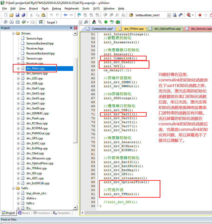 我把UART1的波特率设置放到drv_main.cpp的UART初始化函数后面,这样飞控可以正常启动,屏幕也是正常亮和显示了,不过我不知道这样有没有影响,不过我想想原本commulink任务创建就没有设置串口波特率啊,就是ACfly原本的程序就没有这样,我先这么弄试试,看看能不能通信成功。