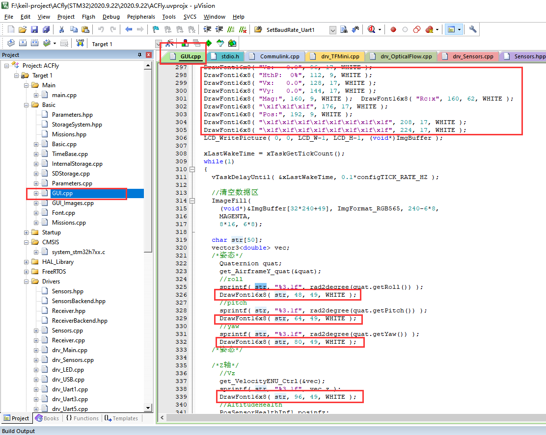 更改显示屏的显示在GUI.cpp这里,我想让显示屏显示出ACfly接收到的T265的位置数据。我是通过在drv_Main.cpp里的init_GUI()顺着查看它的函数定义这样找到的。