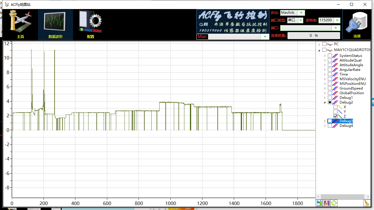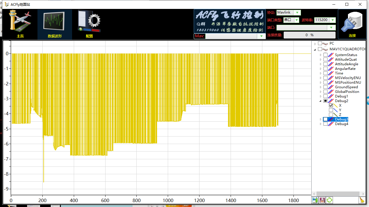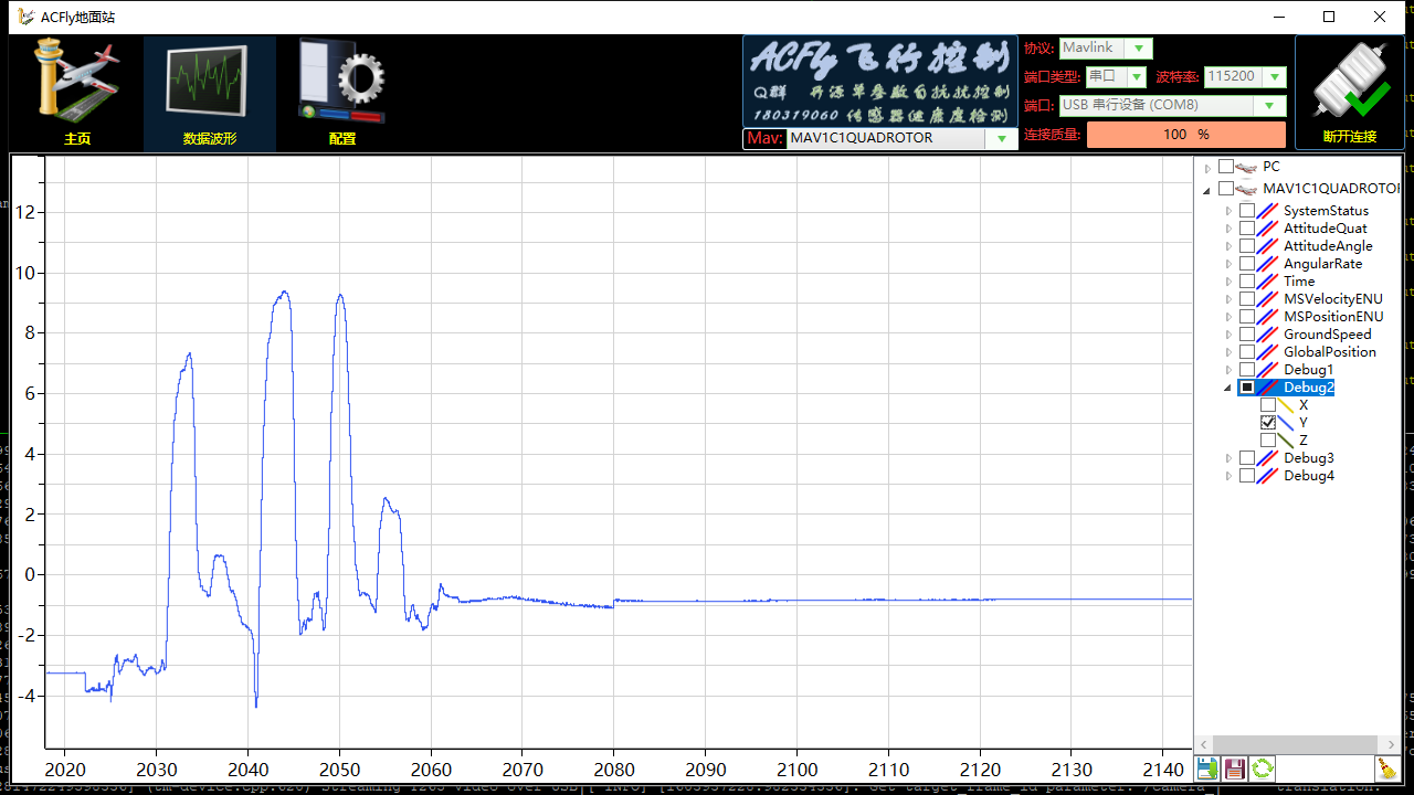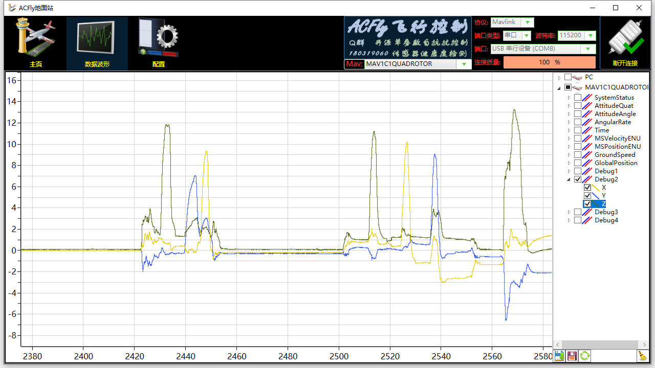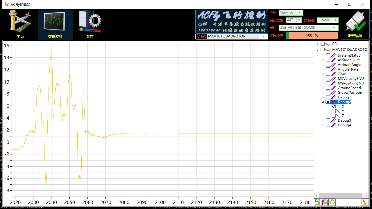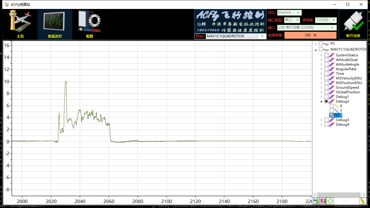 猪哥改了Debug.cpp之后可以在飞控运行时USB连ACfly地面站实时看T265传给飞控的X,Y,Z数据,