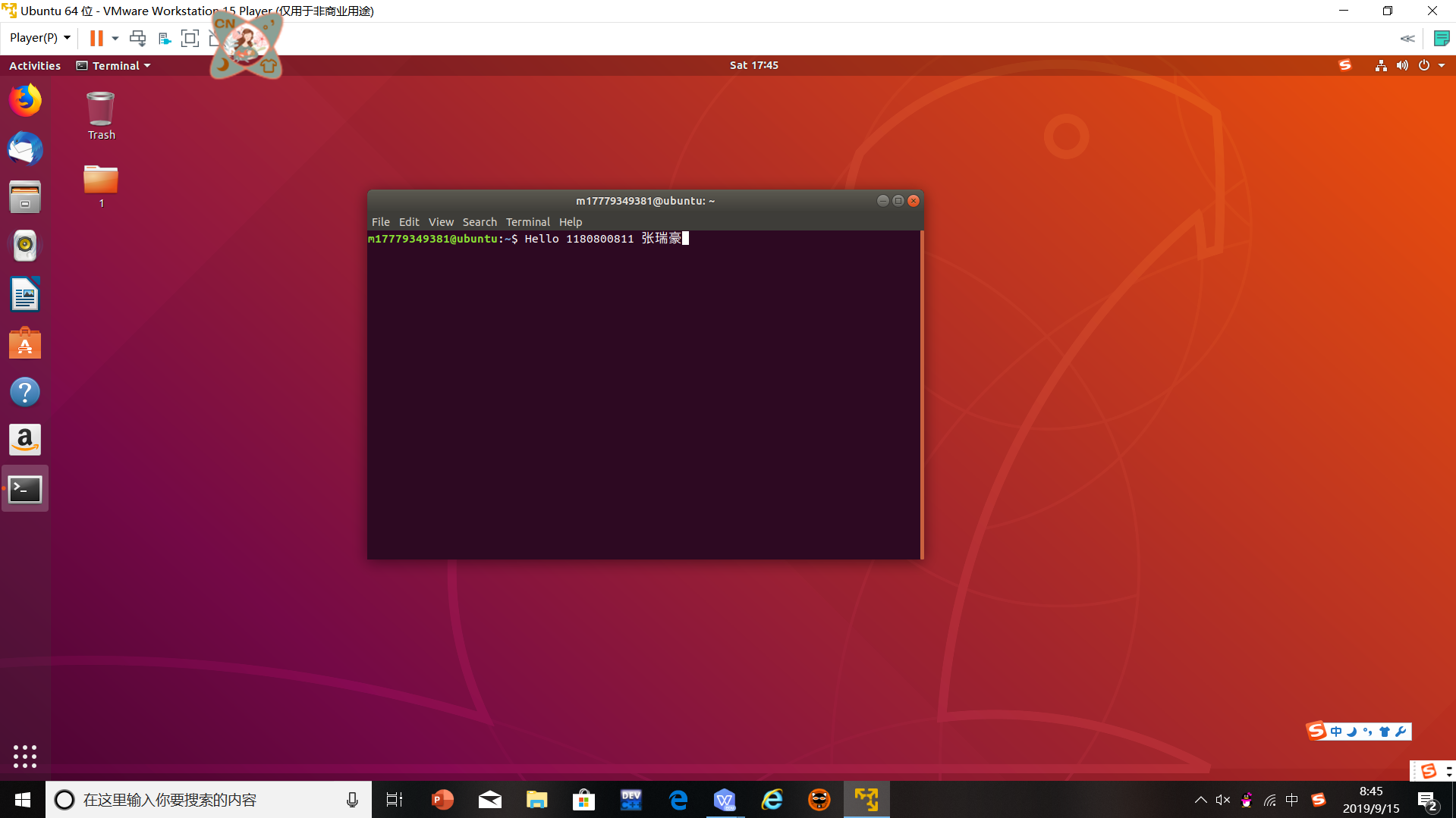 截图:要求有Windows状态行,Vmware窗口,Ubuntu窗口,终端term窗口,输入的“Hello 1160300199学霸”信息