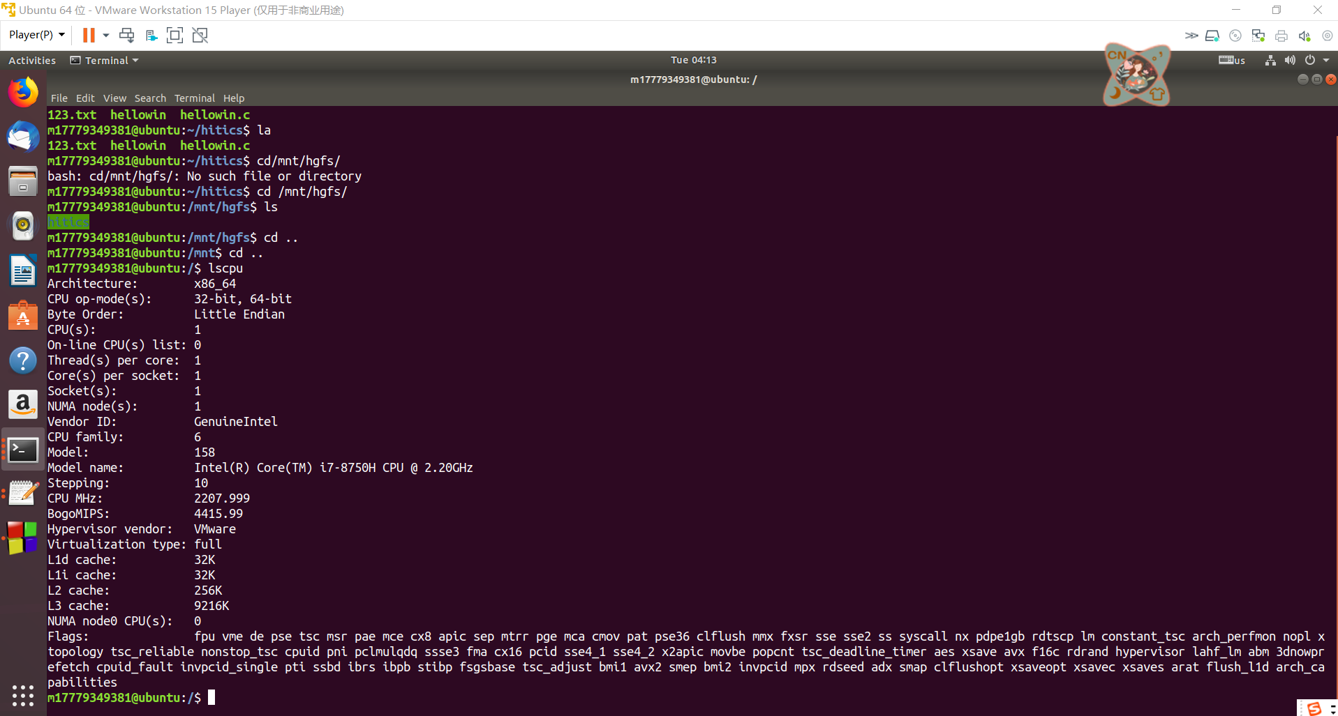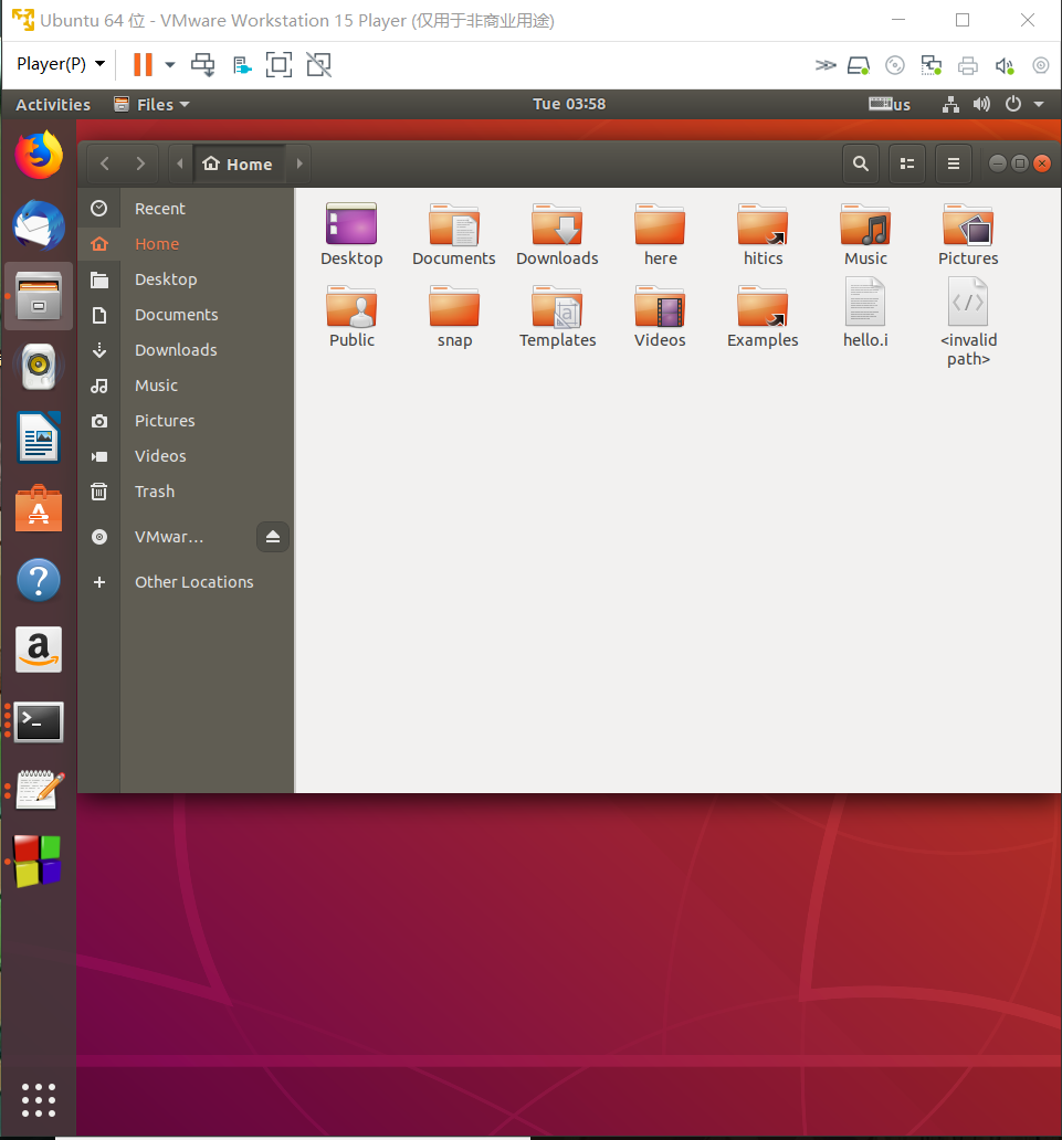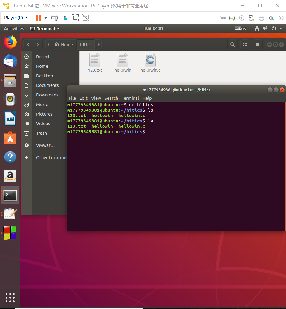 截图:要求有Ubuntu的“文件”应用打开“Home/用户名”,能看到hitics。term
