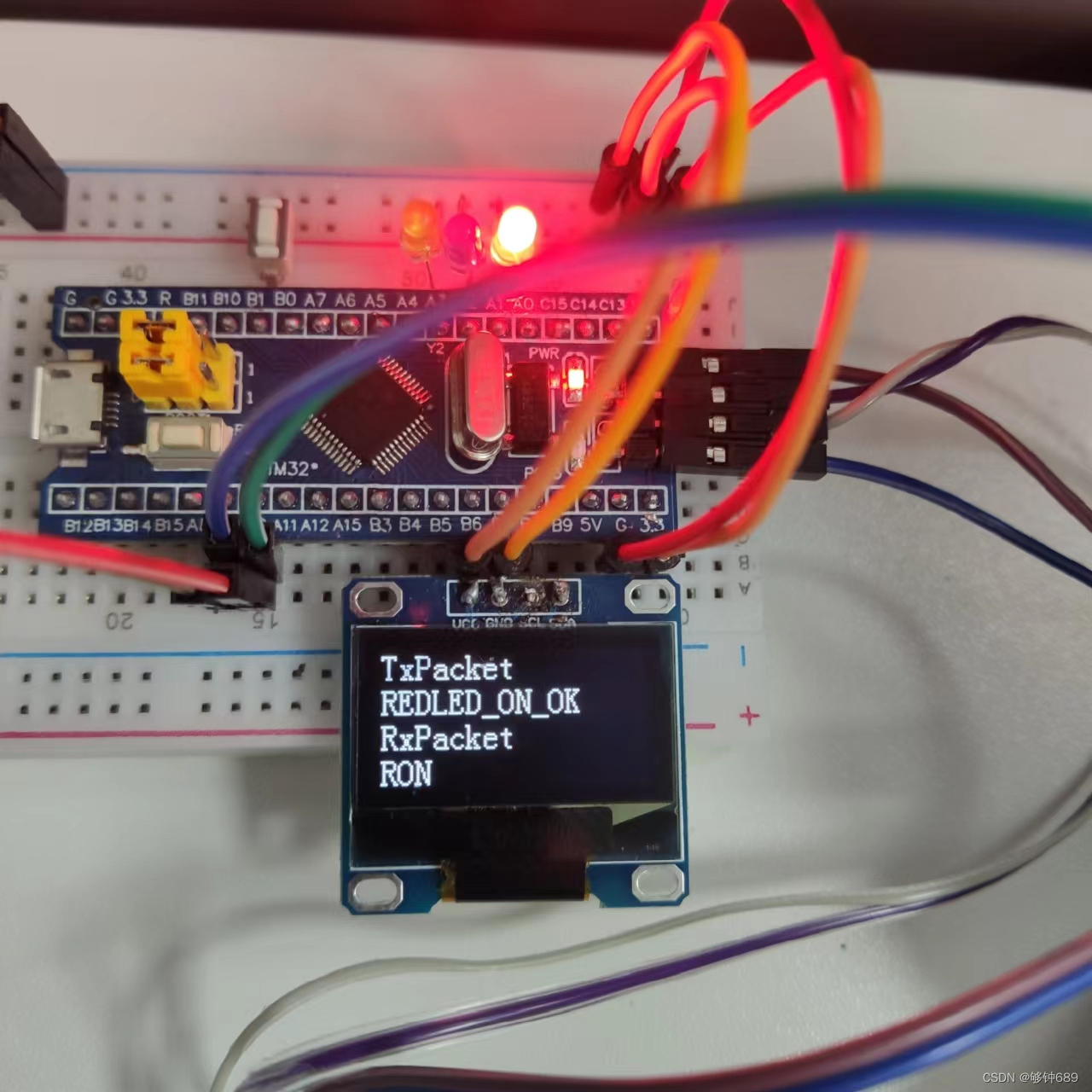 LED灯或者外部外设连接在PA1和PA2以及PA3,我用的是红黄蓝三种颜色的LED来表示,串口通信我们都学过是由主要的RXD和TXD来进行传输的为了表示实现现象的反馈我又外接了4针的OLED显示屏来显示: